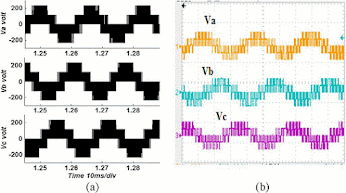 Fig. 2. Line voltage of theVSI in frame (400 V/div–5ms). (a) Simulation. (b) Experiment.